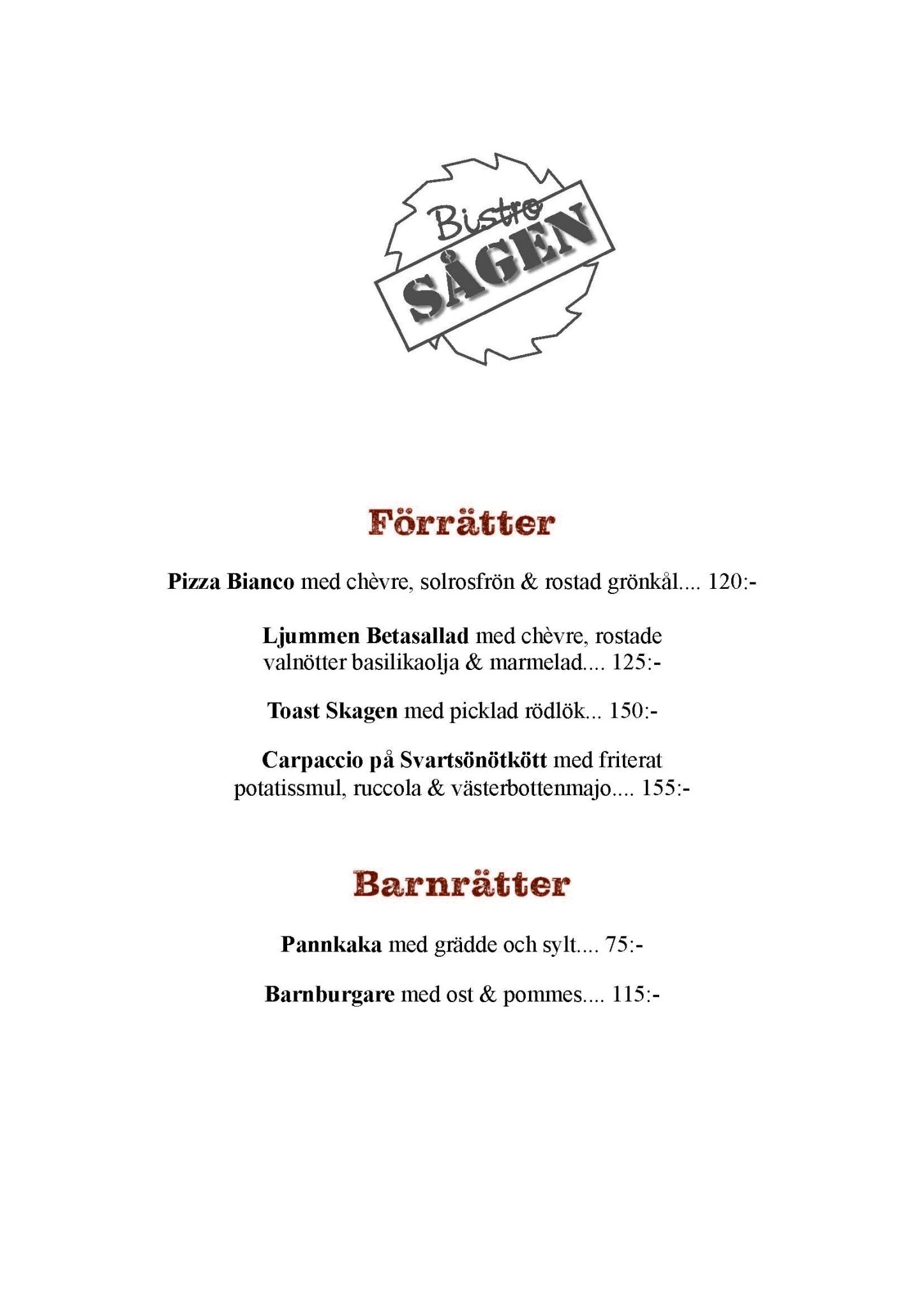 Bistro Sågen låter årstiderna styra menyn. Vi serverar rätter som följer naturens rytm och tar tillvara på det som växer och föds upp i vår närhet. En stor del av råvarorna kommer från vår egen gård och från producenter i skärgården, vilket gör att menyn förändras efter säsong och tillgång. Hos oss kan du njuta av allt från enkla förrätter och vällagade husmansklassiker till grillrätter, burgare och hemlagade desserter.